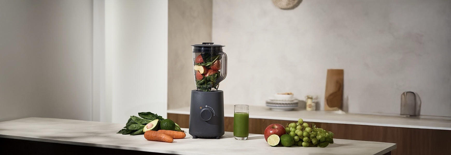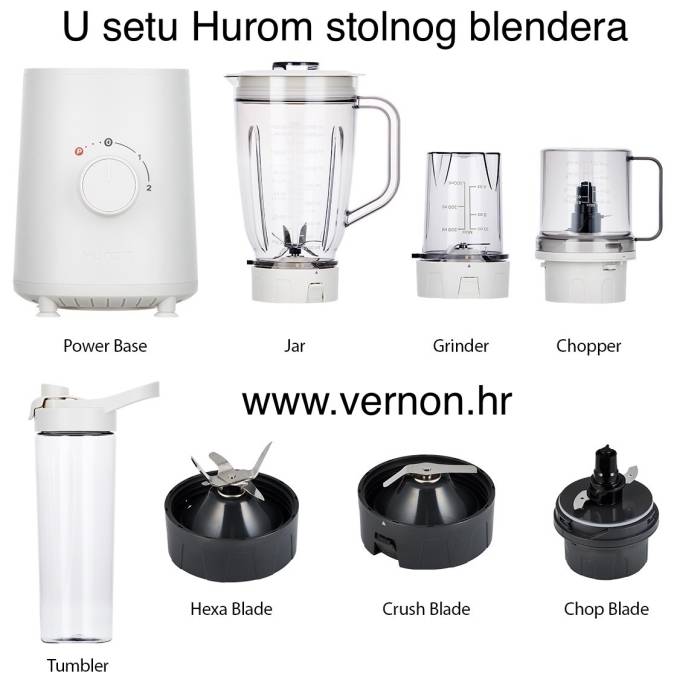 AKCIJA Hurom Table Blender-stolni blender 1.000 W 22.000 okretaja u minuti posuda 1500 ml, sjeckalica 450 ml, mlinac 300 ml, čaša 500 ml